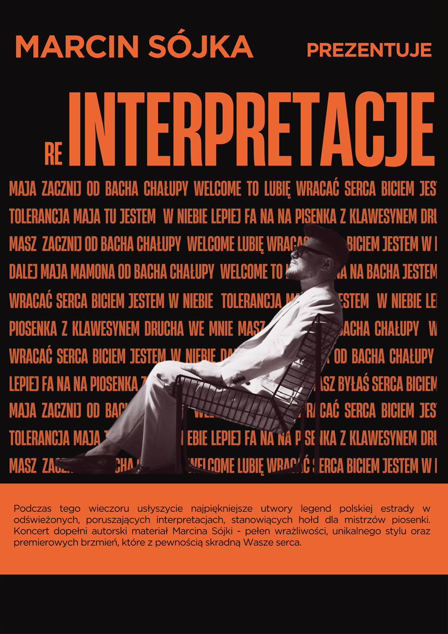 "Reinterpretacje" to wyjątkowy, premierowy koncert Marcina Sójki – artysty o charakterystycznym głosie i wrażliwości muzycznej, który zaprasza publiczność w podróż przez nowe odsłony dobrze znanych dźwięków.
